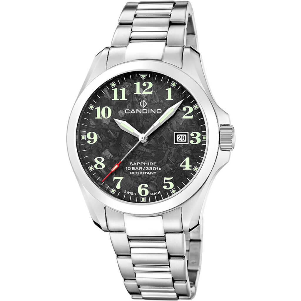 La propuesta más aventurera de Candino. Este modelo combina robustez y funcionalidad con un diseño moderno inspirado en los relojes de campaña. Su caja de 41.5 mm en acero 316L, cristal de zafiro y movimiento suizo Ronda 715 lo convierten en un aliado fiable en cualquier terreno. Destaca su esfera de fibra de carbono con índices Superluminova, que asegura máxima legibilidad incluso en la oscuridad. Con resistencia al agua de 10 ATM y tres correas incluidas (acero, piel y NATO), el C4785 se adapta con naturalidad de la montaña a la ciudad. PVP. 249,00 €