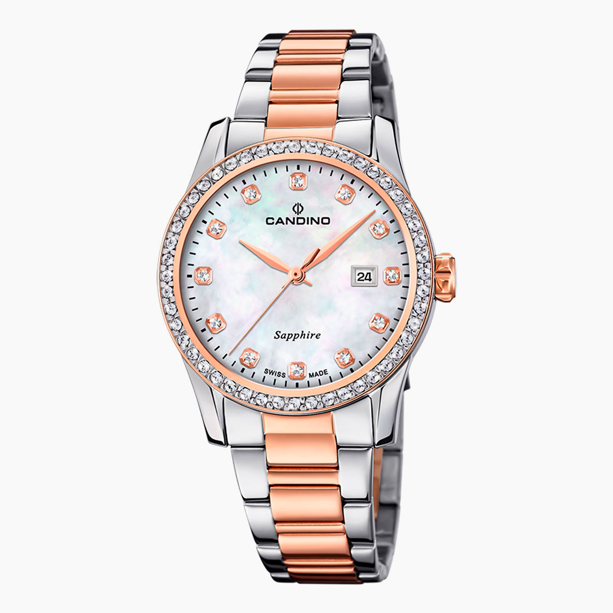 La delicadeza del nácar auténtico se combina con la precisión suiza en un reloj que encarna la elegancia femenina atemporal. Su esfera luminosa, adornada con índices de zirconita, refleja la luz de forma sutil, mientras que su caja de acero inoxidable de 33 mm y resistencia de hasta 10 ATM lo convierten en un accesorio refinado y a la vez práctico. Ideal como regalo o como joya personal que trasciende modas. PVP. 199,00 €