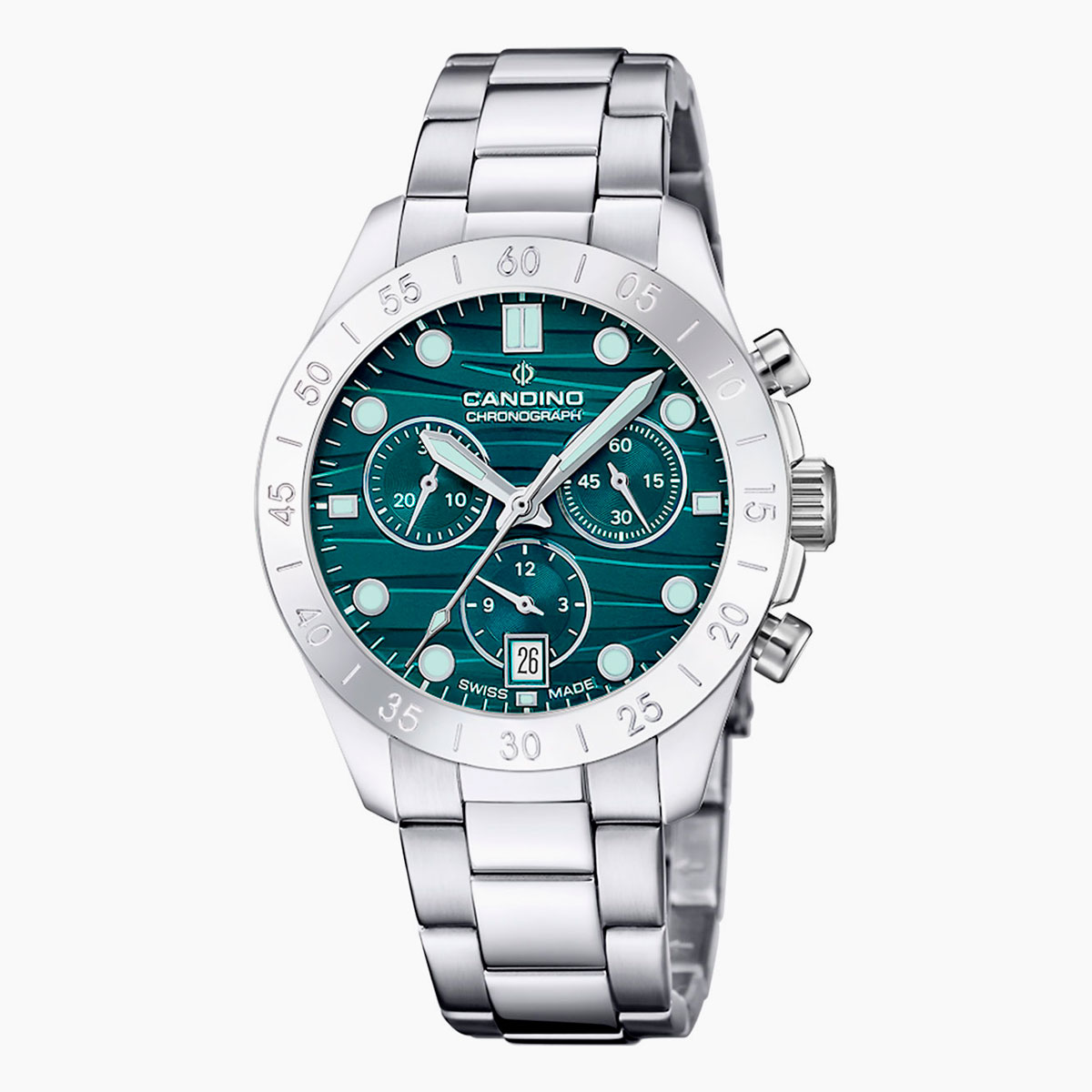 La fuerza de un cronógrafo se combina con la sutileza de un diseño contemporáneo. Este modelo destaca por su caja de acero inoxidable de 39 mm y cristal de zafiro, que resguarda un movimiento suizo Ronda 5030.D, símbolo de fiabilidad. Su tono verde petróleo, poco convencional en la relojería femenina, aporta frescura y modernidad. Los índices adornados con zirconita aportan un brillo discreto que lo convierte en el equilibrio perfecto entre funcionalidad y glamour. Un reloj versátil que pasa con naturalidad de la oficina a una velada nocturna. PVP. 299,00 €