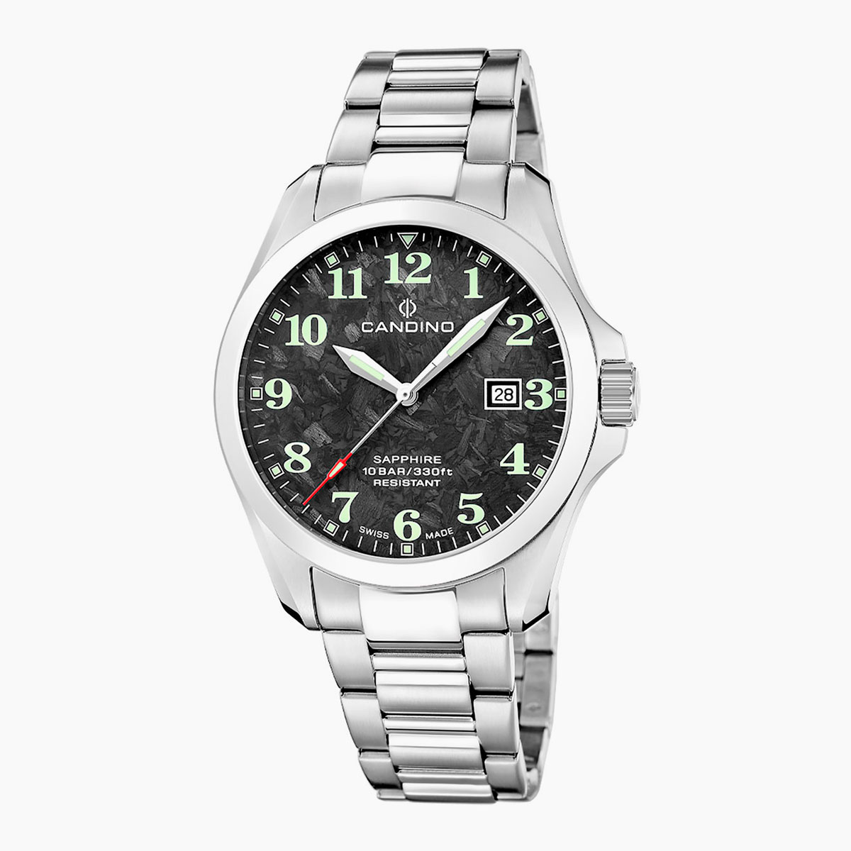 La propuesta más aventurera de Candino. Este modelo combina robustez y funcionalidad con un diseño moderno inspirado en los relojes de campaña. Su caja de 41.5 mm en acero 316L, cristal de zafiro y movimiento suizo Ronda 715 lo convierten en un aliado fiable en cualquier terreno. Destaca su esfera de fibra de carbono con índices Superluminova, que asegura máxima legibilidad incluso en la oscuridad. Con resistencia al agua de 10 ATM y tres correas incluidas (acero, piel y NATO), el C4785 se adapta con naturalidad de la montaña a la ciudad. PVP. 249,00 €