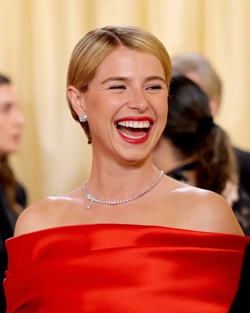 El collar tipo torque de Rose Byrne tampoco pasó desapercibido, incluso se ha hecho viral en redes sociales al tratarse de una pieza con diamante champán en forma de pera, colgando de un collar asimétrico diseñado por Taffin de James De Givenchy. Diseñado para la ocasión, lo especial de este collar es su diamante del desierto o “desert diamonds”, piedras naturales que llegan principalmente desde Botswana y Namibia y que se distinguen por su amplia gama de tonos cálidos. Según datos de De Beers, el interés global por estas gemas se disparó en 2024; solo en plataformas digitales generaron más de 250.000 menciones y 450 millones de visualizaciones, impulsadas por las celebridades que empezaron a lucirlas en eventos y alfombras rojas y, desde entonces, su auge sigue siendo constante.