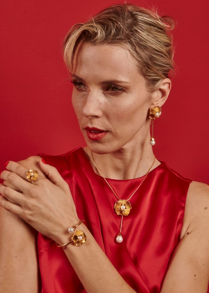 Desde collares hasta pendientes, cada pieza de la colección Clavelina es una obra de arte única, diseñada para añadir un toque de primavera a cualquier look. Los collares están creados con perlas blancas en el centro de los claveles; los pendientes, el nuevo crush de la colección, añaden puntos de luz al rostro, mientras que, el brazalete ajustable y de estilo atemporal y contemporáneo, une perlas de diferentes tamaños que evocan al refinado clásico y estilo contemporáneo. Joyas doradas que añaden un encanto mágico que realza la luminosidad de las perlas.