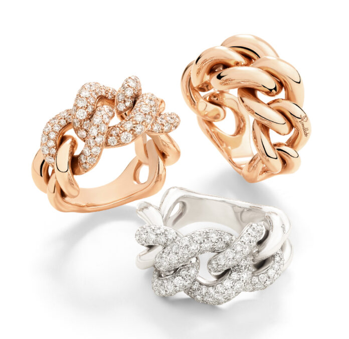 Desde hace décadas, la sencilla cadena icónica de Pomellato ha evolucionado hasta convertirse en una extensa colección de exquisitas joyas: desde piezas de uso cotidiano hasta impresionantes creaciones de alta joyería. Bajo esta filosofía, la Maison presenta Catene, una nueva colección compuesta por un collar, una pulsera y unos pendientes de alta joyería en oro rosa, otra tendencia que ha conquistado el universo de la alta joyería. Joyas cubiertas totalmente por diamantes que continúan la tradición de crear obras maestras contemporáneas de orfebrería milanesa al más alto nivel de lujo.