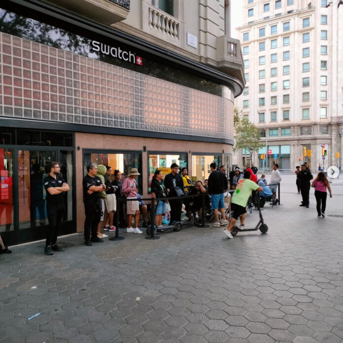 Siendo honestos, que consumidores hagan cola la víspera de un lanzamiento es algo a lo que estamos acostumbrados si hablamos de sneakers, productos tecnológicos o colaboraciones fuertes en el mundo de la moda pero, en el sector relojero no es algo a lo que nos hayamos acostumbrado (de momento). Y, lo cierto es que mientras Swatch repite fórmula y cambia las reglas, las colas infinitas vuelven a ser noticia. Madrid, Barcelona y Valencia han sido testigos de ello y TikTok lo ha corroborado mostrando colas en las que incluso se podía ver como la gente había pasado la noche (o incluso más horas) en la calle, a las puertas de las tiendas Swatch. Una colaboración que, como ocurrió con Omega, dio la vuelta al mundo y, por ejemplo, en Singapur la cola era de más de 200 compradores. El sábado 9 de septiembre, la caja amarilla que ya es también otro icono de Swatch, puesto que es la caja en la que viven estas colaboraciones, fue abierta y descubierta para, a continuación, abrir las puertas de cada tienda Swatch.