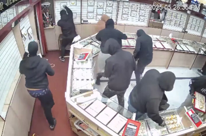 El asalto fue ejecutado por casi una veintena de individuos enmascarados, que irrumpieron en el establecimiento con herramientas como martillos y mochilas para romper las vitrinas