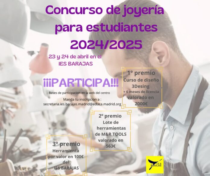 El IES Barajas de la Comunidad Autónoma de Madrid organiza el I Concurso de Joyería para estudiantes de primer y segundo año. El concurso tiene como objetivo fomentar la creatividad, el diseño y las habilidades técnicas en la creación de piezas de joyería, al mismo tiempo que se promueve la experimentación con materiales, formas y técnicas de la joyería artesanal.