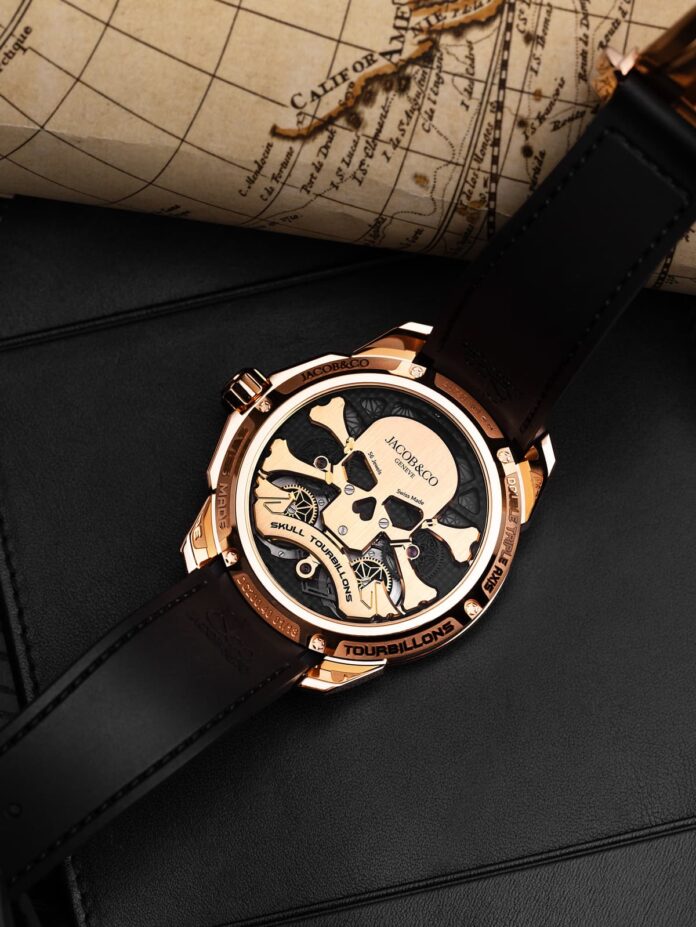 Fabricado a mano en una caja de oro rosa de 46 mm, esta obra de arte alberga un mecanismo manual con una reserva de marcha de 48 horas. En su fondo de caja, el reloj revela una calavera esculpida que no solo brilla a través de su diseño intrincado y delicado, sino que también refuerza la audacia de Jacob & Co como líder de la industria relojera.