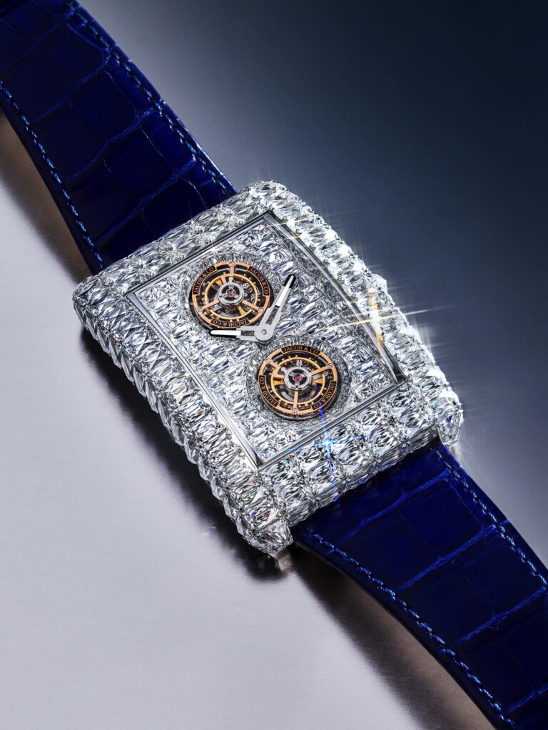 La caja de oro blanco de 54 x 41 mm está engastada con 98 diamantes Angel Cut que suman más de 51 quilates, muchos de ellos de gran tamaño. La esfera continúa esta arquitectura lumínica con otros 88 diamantes, enmarcando los dos tourbillones con una simetría perfecta.