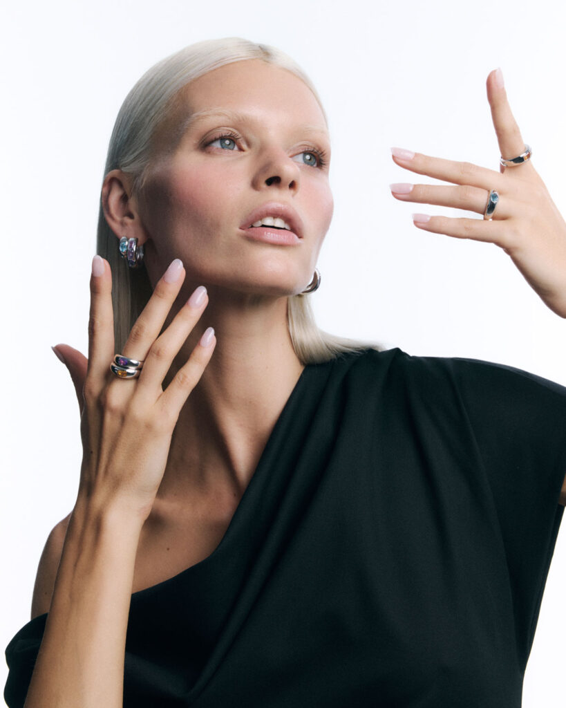 Dentro de esta propuesta, las colecciones PRISM y GLIMMERS dan vida a esta visión a través de anillos, pendientes, collares y pulseras en plata de primera ley, engastadas con gemas naturales de colores intensos como el azul sereno del topacio, el dorado luminoso del citrino y los matices verdes y púrpuras de la amatista. Colores y formas que, además, permiten otra de las grandes tendencias del momento, el stacking, para lograr así un efecto visual poderoso y atrevido donde la energía del color se convierte en protagonista.
