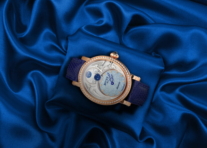 Un modelo que se presenta en una exclusiva caja en forma de “escritorio” de Bovet, que muestra la esfera en la muñeca. Disponible en oro rojo de 18 quilates, la caja de 43 mm x 38,70 mm está engastada con 174 diamantes de talla redonda (0,99 quilates) y otros 72 diamantes en el bisel (1,00 quilate) y la corona cabujón, como en la imagen, o simplemente engastados en el bisel. Todas las versiones llevan índices de diamantes en la esfera.