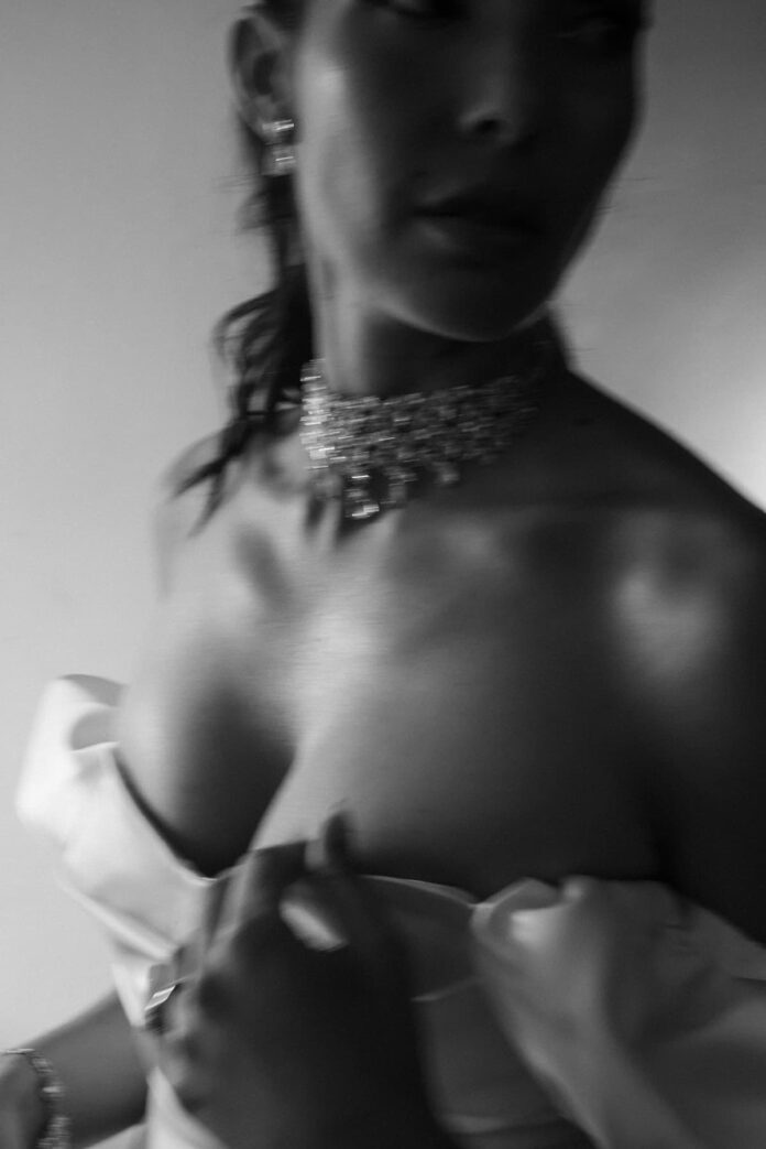 El primer look destacó por su estética Bridgerton, tendencia absoluta de la temporada. Un vestido con escote palabra de honor y manguitos abullonados, drapeado sutil bajo el pecho para potenciar la silueta y falda adornada con una gran abertura lateral que brilló con un espectacular choker, a juego con un maxi brazalete.