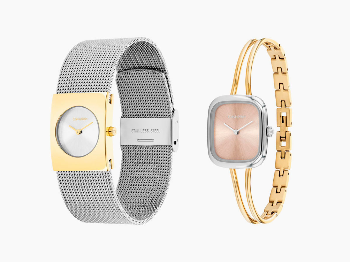 Mientras que CK Adore encarna la esencia del reloj joya contemporáneo: una delicada caja tank de 24 mm unida a un brazalete tipo bangle ajustable, disponible en tonos dorados, plateados y oro rosa empolvado.