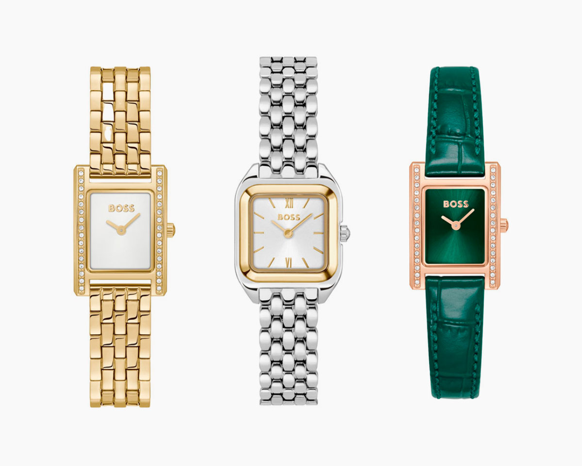 Con un enfoque más estructurado y sofisticado, BOSS redefine el poder de lo pequeño. Mae Petite presenta una caja cuadrada de 22 mm en oro amarillo y un brazalete de cinco eslabones que aporta una sensación de elegancia pulida. Una pieza que destila equilibrio y fuerza contenida.