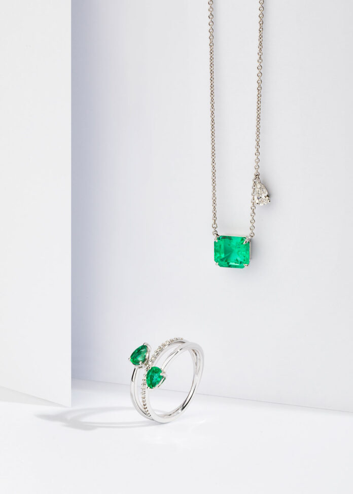 O el colgante oro blanco con esmeralda talla cuadrada de 2,80 quilates y diamante talla pera de 0,29 quilates en el que la profundidad del color y las facetas escalonadas de la talla cuadrada se fusionan con la delicadeza de un diamante talla pera, cuya forma de lágrima no solo aporta un brillo refinado, sino que estiliza y dinamiza el diseño.