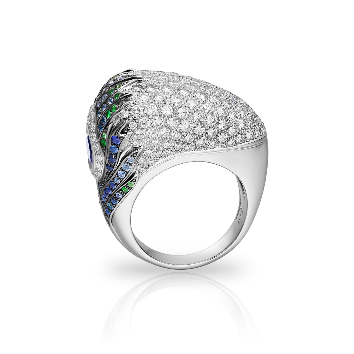 Anillo Carnaval. Anillo de oro blanco de 18 quilates, perteneciente a la colección Peackock, con 163 diamantes, 14 granates, 63 zafiros y 1 iolita.