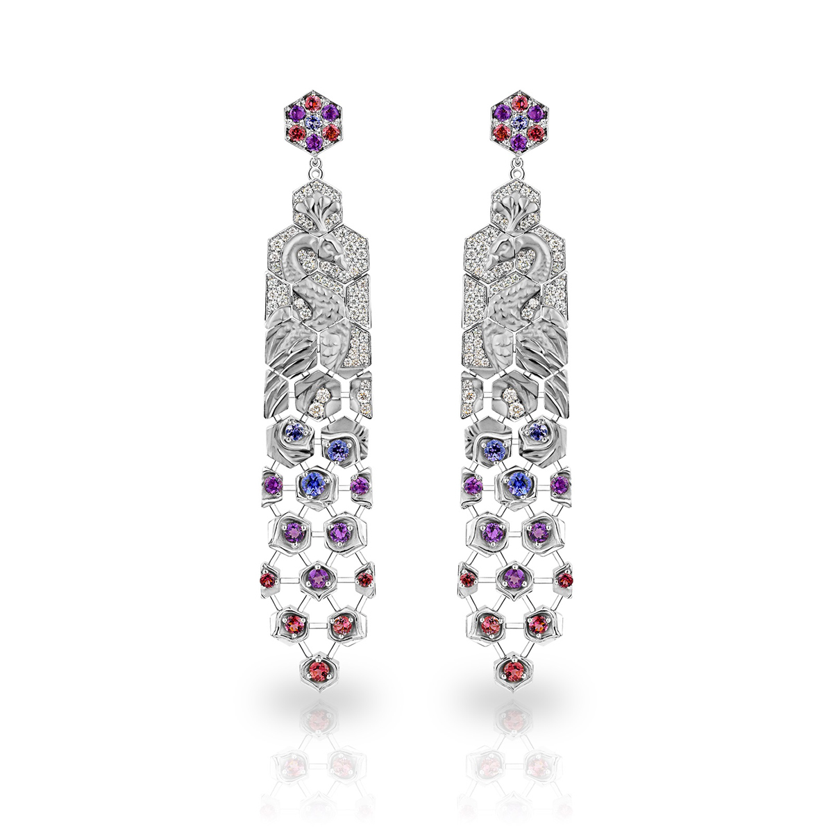 Pendientes Jardín de los Placeres Maxi. Estos pendientes de oro blanco de 18 quilates de la colección Origen, cuentan con 120 diamantes, 8 tanzanitas, 16 amatistas y 16 rubelitas.