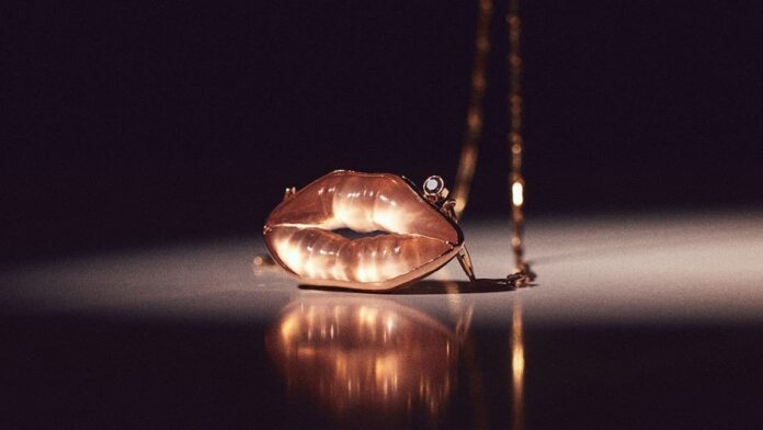 La colección más reciente y popular presenta labios colgando de collares de oro amarillo de 14 quilates, adornados con rubíes o diamantes