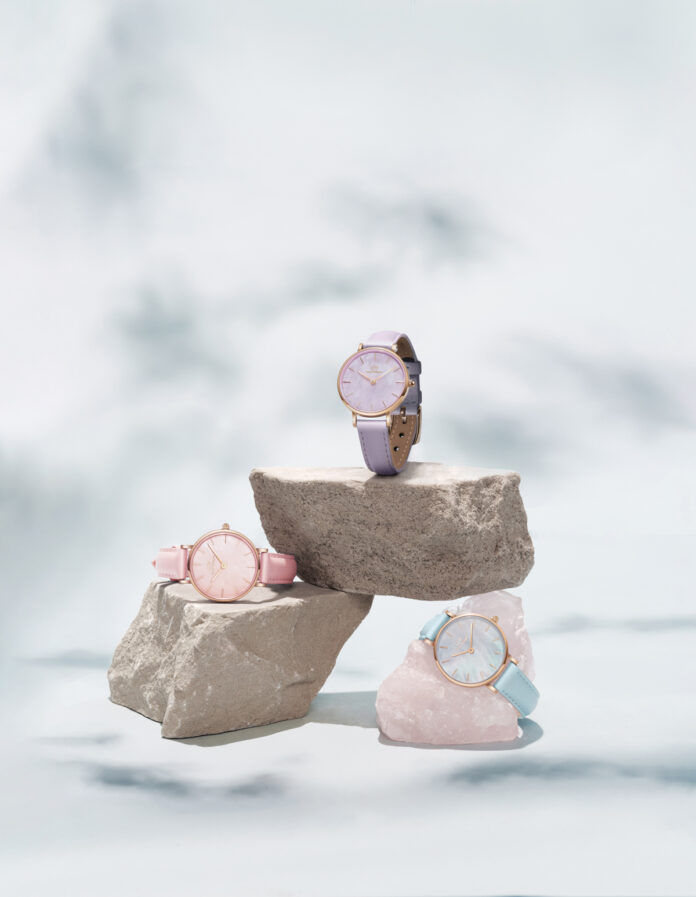 La nueva colección Pastel reinterpreta los modelos tradicionales de la marca, con esfera de nácar y correas de genuina piel italiana en rosa, azul y lila