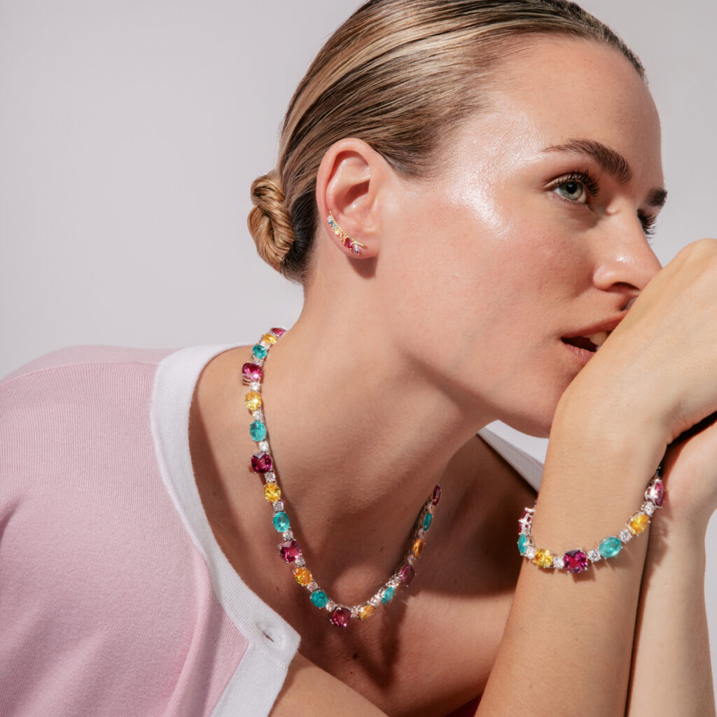 En la lista de las joyas más deseadas de Luxenter que resurgen con una nueva estética encontramos las emblemáticas gargantillas de bolas minerales, que regresan con más fuerza que nunca. Tonos empolvados de morganita, aguamarina o berilo conviven con intensos naranjas, rojos y fucsias que llenan de energía cada look. El diseño se complementa con entrepiezas bañadas en oro y detalles de circonitas que elevan la joya y la convierten en un icono atemporal.