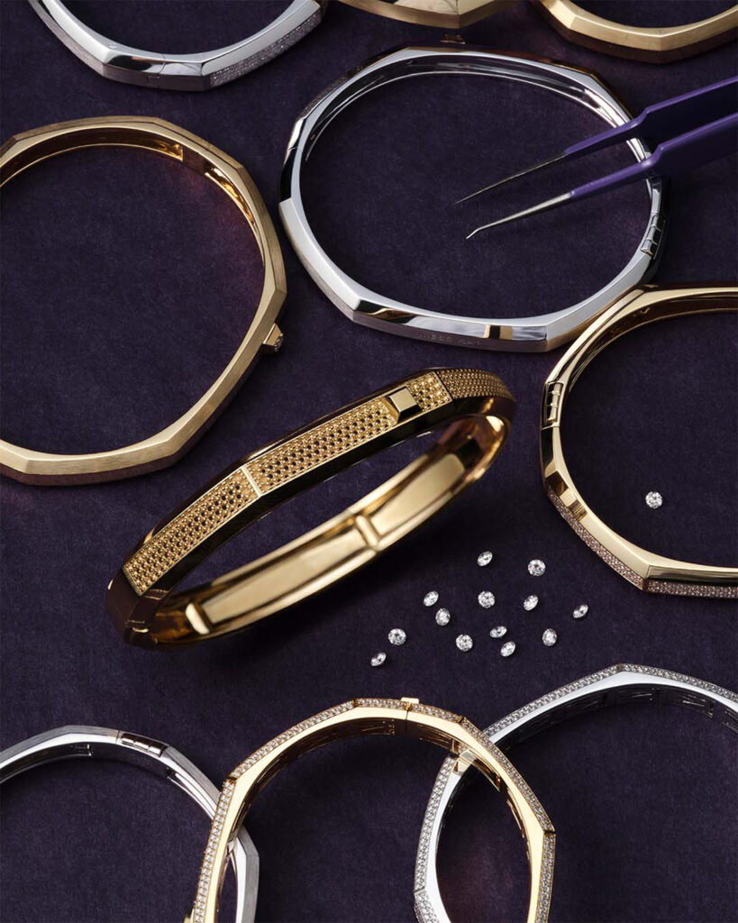Aunque el oro ocupa el primer plano, los diamantes permanecen siempre presentes. Juntos dialogan, capturando e intensificando el resplandor. Pulida o cepillada, cada textura revela una vibración distinta y, con ella, una emoción singular.