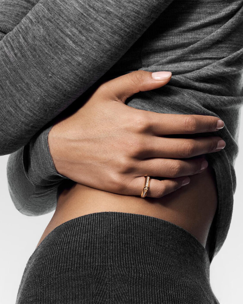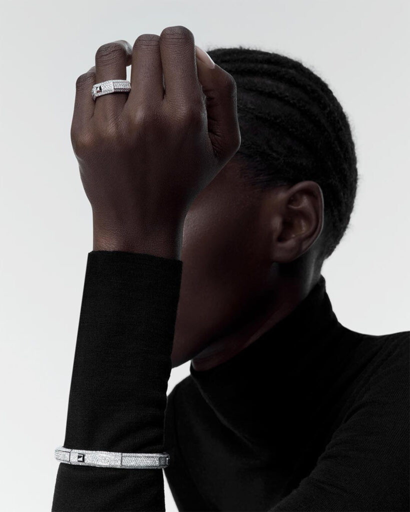 Una geometría que además equilibra lo masculino y lo femenino, donde poder y sensibilidad se sostienen como una sola entidad; el círculo apacigua, el ángulo afirma. Dos energías opuestas, ahora fundidas en una única arquitectura joyera.