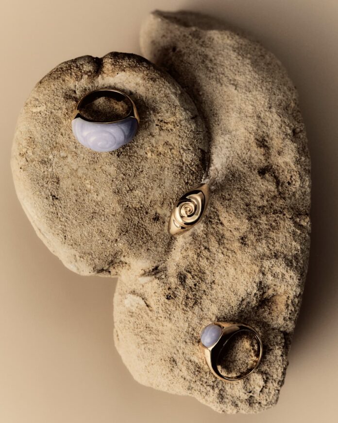 La novedad de esta colección, además de estar formado por piezas en las que las formas geométricas vuelven a ser protagonistas, reside en los materiales: el cristal de roca y la Ágata azul. Ambos materiales, tallados y pulidos a mano y engastados en plata bañada de oro de 18 quilates, son el centro de esta colección gracias a sus hipnóticos tonos; tonos etéreos que evocan el movimiento y la claridad del agua.