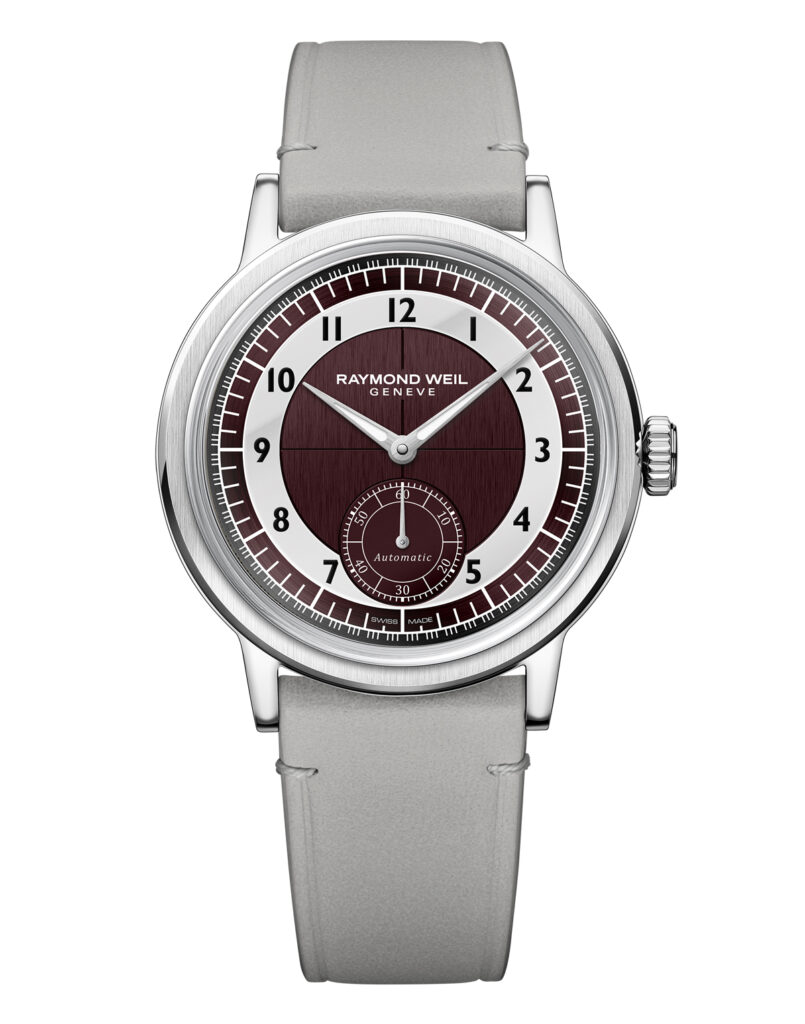 Con el millesime Small Seconds, RAYMOND WEIL revisita la esfera tipo esmoquin, un estilo de diseño que vive un notable resurgimiento, definido por audaces contrastes bicolor y una elegancia formal. Tres armonías de color distintas dan forma a este nuevo capítulo: blanco y negro, evocando códigos atemporal de la vestimenta de gala; azul medianoche combinado con negro, evocando la profundidad y suavidad de los tejidos formales y burdeos con gris claro, una interpretación más audaz que refleja la identidad cromática en evolución de la Maison.