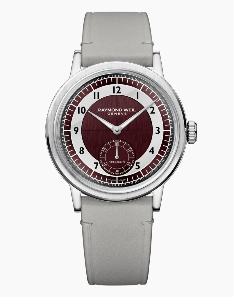 Con el millesime Small Seconds, RAYMOND WEIL revisita la esfera tipo esmoquin, un estilo de diseño que vive un notable resurgimiento, definido por audaces contrastes bicolor y una elegancia formal. Tres armonías de color distintas dan forma a este nuevo capítulo: blanco y negro, evocando códigos atemporal de la vestimenta de gala; azul medianoche combinado con negro, evocando la profundidad y suavidad de los tejidos formales y burdeos con gris claro, una interpretación más audaz que refleja la identidad cromática en evolución de la Maison.
