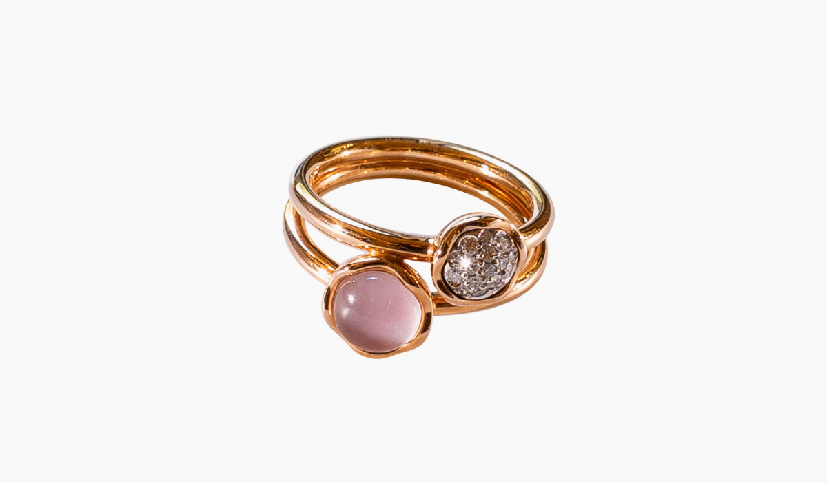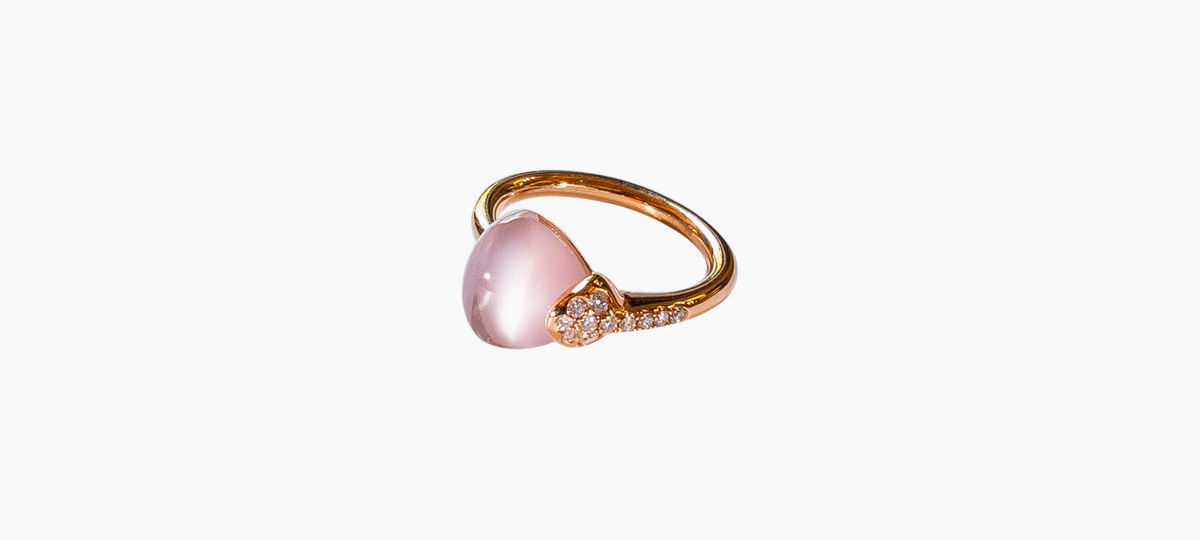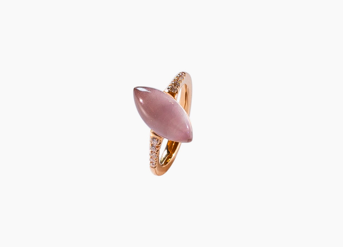 El cuarzo rosa se combina con la calidez del oro rosa en tres creaciones que transmiten identidad propia: la primera presenta un diseño semi triangular en talla cabujón que destaca por sus líneas limpias y depuradas. El cuarzo rosa, trabajado en una talla ovalada de gran suavidad, se integra de forma armoniosa en un anillo de oro rosa que respira sobriedad y elegancia.