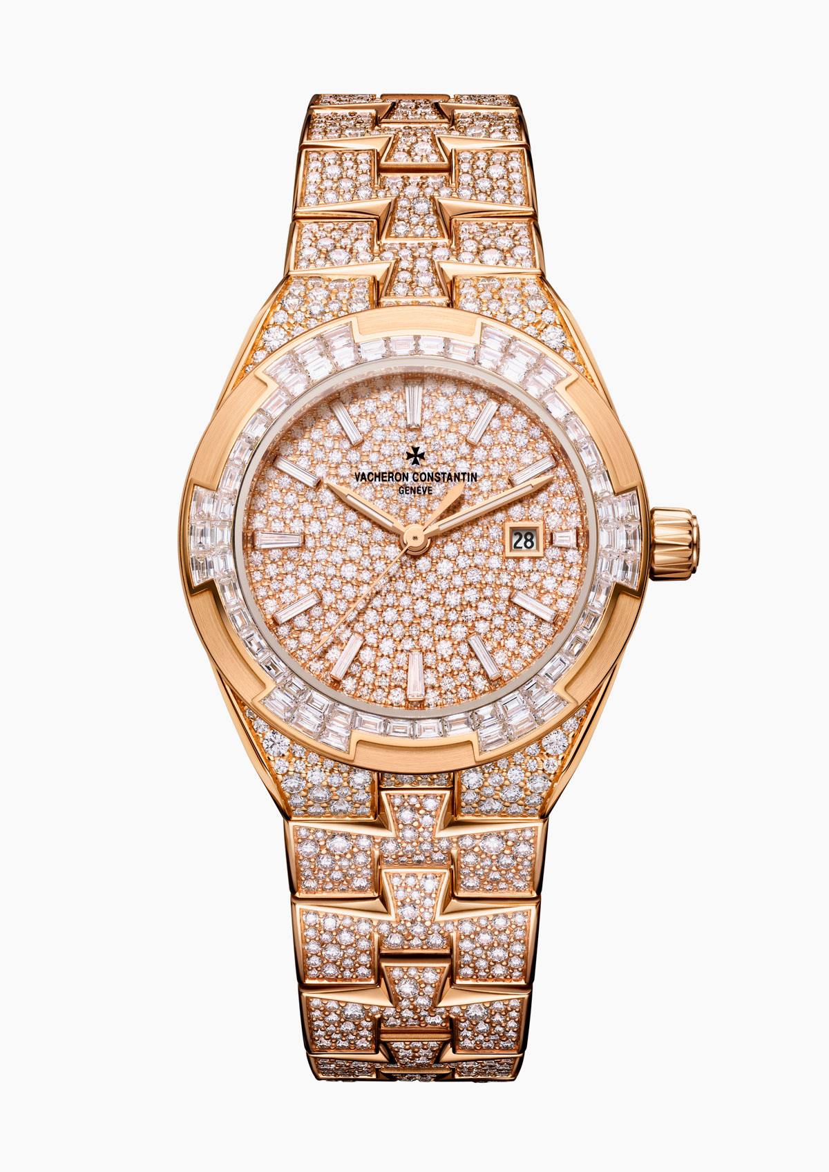 El bisel, inspirado en la Cruz de Malta, emblema de la Maison y seña distintiva de Overseas, está realzado con 60 diamantes talla baguette (~2,28 quilates) mediante un exigente engaste invisible. Esta técnica, una de las más complejas del mundo de la joyería, crea la ilusión de que las piedras flotan sobre el oro, sin ningún soporte visible. Cada diamante debe tallarse con una precisión extrema, con tolerancias de apenas 0,02 milímetros, y el engaste de una sola piedra puede requerir varias horas de trabajo artesanal.