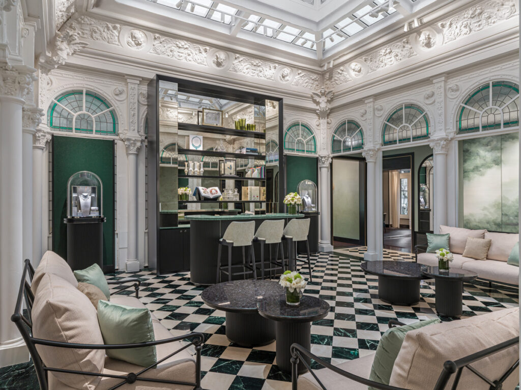 La experiencia continúa en los salones, donde amplias estanterías exhiben el patrimonio de la Maison. Mientras tanto, un luminoso atrio de cristal, conocido como “El Jardín de Invierno”, ofrece una zona de recepción fresca y acogedora, que también alberga un Bar Lounge. En la planta baja, un salón en tonos verdes crea una conexión armoniosa con la decoración floral de la entrada, completando una experiencia que combina elegancia, luz y el espíritu poético de Van Cleef & Arpels.